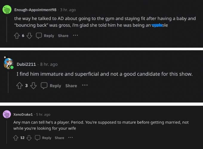 Someone else added, “I find him immature and superficial and not a good candidate for this show.”